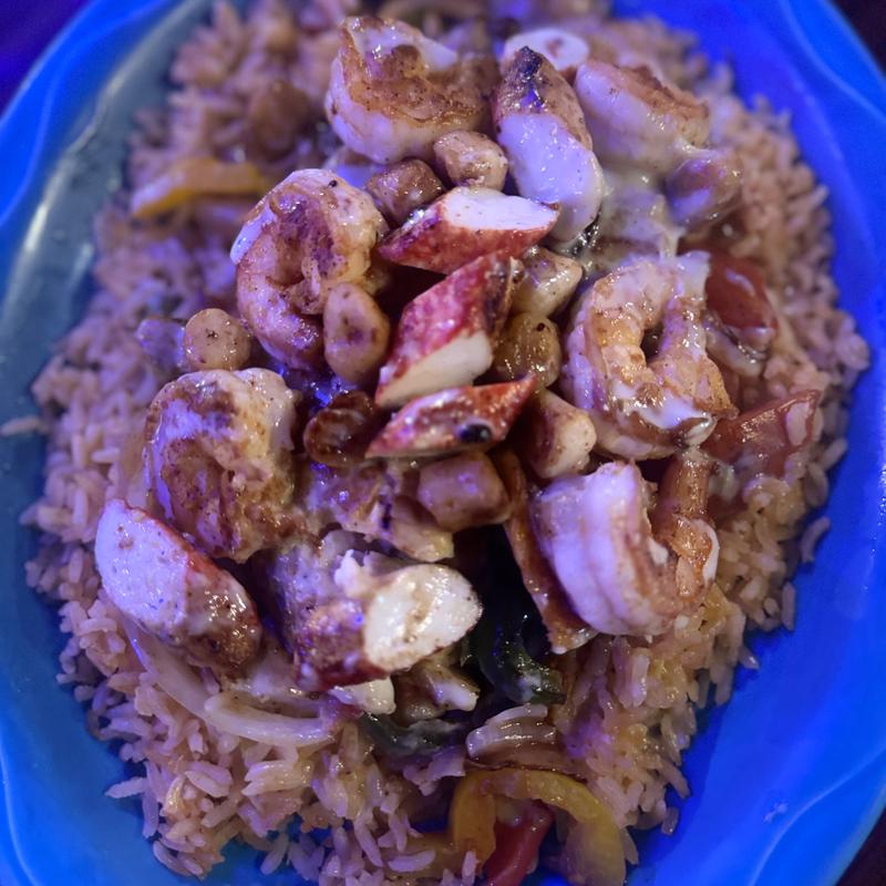 Two soft or fried flour tortillas filled with shrimp, imitation crab, lobster, scallops, mixed peppers, onion, tomato, and celery. Topped with our own seafood dressing. Served with rice or beans and guacamole salad.